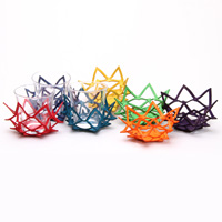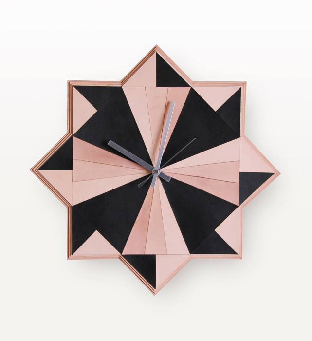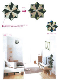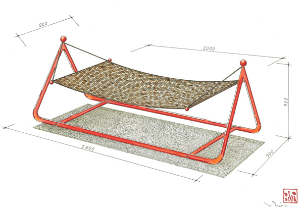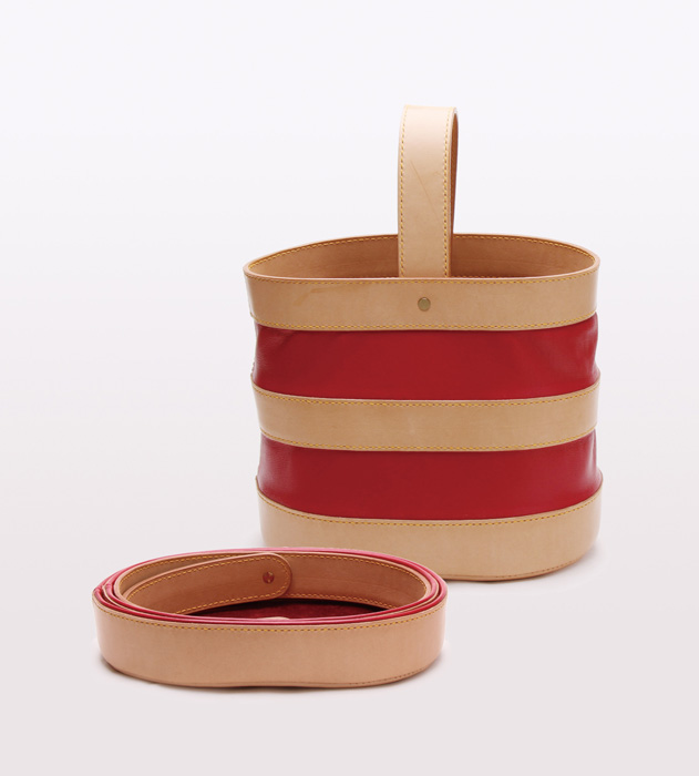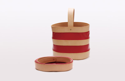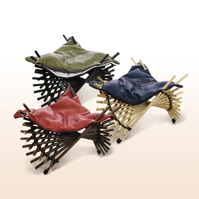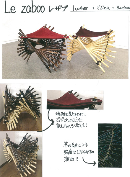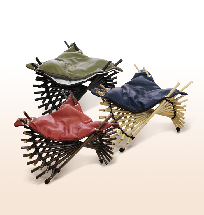 革の持つ柔軟さ、なじみやすさそして強度を、幾何学的な造形によって、最大限に引き出されている。竹と革という珍しい共演により、それぞれの素材の美しさを引き立たせている。さらに、ざぶとんのように上に積み上げられるという楽しさと供に収納面でもその便利さを主張している。