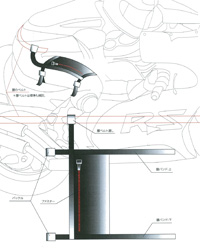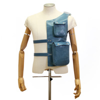 オートバイに乗っていて使いやすい太ももの上にバッグを持ってきました。財布、高速道路の通行券、ハンカチ、ティッシュなどが収納できる薄手のバッグ。腿に固定する2本のベルトと、下にずり落ちないように腰のベルトにつなぐベルトで構成しました。