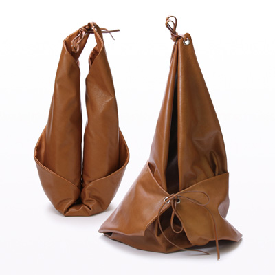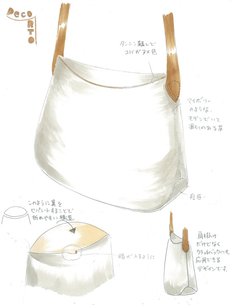 ペコ(peco)っと折ると(orto)口が閉じるかばん。平面のものを立体に起こす紙箱の構造からヒントを得ました。ハリがあるのにしなやか。といった革の特性を活かすことのできるデザインだと考えます。金具を必要としないのも特徴です。