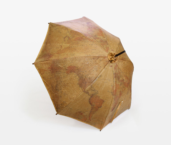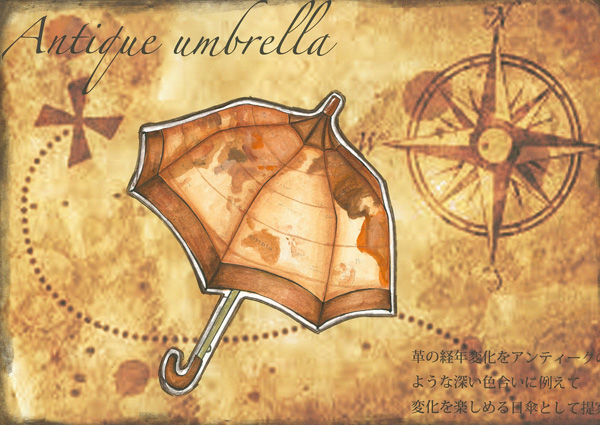 まるでアンティークの地球儀のような味わいのある日傘を全てレザーで使用することにより、経年変化でさらに味わいのある深い色合いへと変化していく様子を楽しめます。