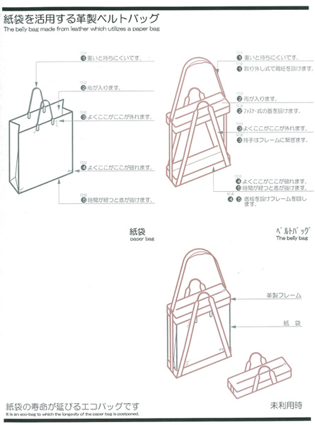 紙袋を大切に使用可能にする革製のエコバックです。フレームはベルトでできた折り畳み式のバッグです。紙袋のデザインにより様々なデザインを楽しめます。