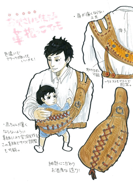 革の抱っこひもだとかなり頑丈でしっかりと赤ちゃんを支えてくれるはずです。従来の抱っこひもだとなんだか恥ずかしかったお父さんもこんな抱っこひもであれば使ってくれるんじゃないかと思い細部のディティールにもこだわっておしゃれに仕上げました。丈夫で長い間使えるし加工がしやすい革の長所を最大限に生かせるアイテムだと思います。