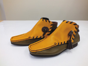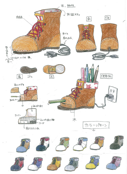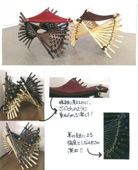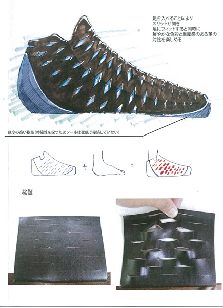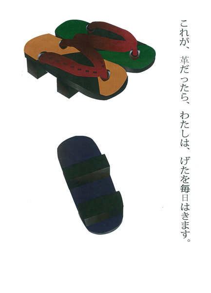 西洋にはブーツという革でできた靴があれば、日本には、げたがある。それを革にしてみたら新たなげたができるのではないだろうかと思いこの作品にしました。色も革なので可愛い色になると思います。