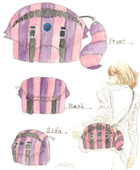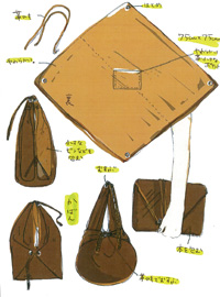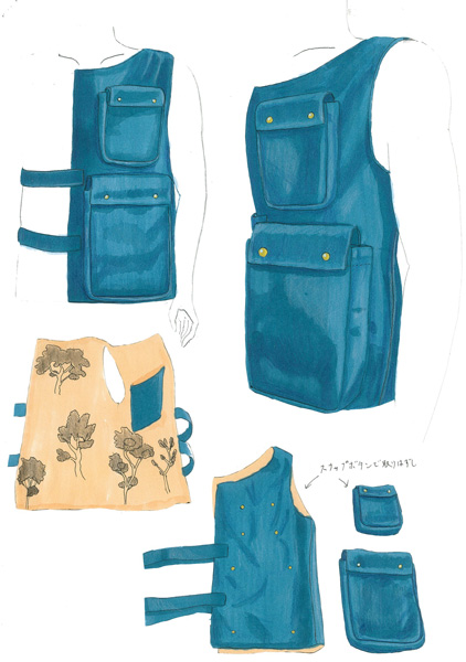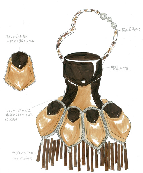 「分け合う」をテーマにして考えました。用途は、ごちゃごちゃしがちなかばんの中を分かりやすく分別する事です。また、かばん本体に付いている6個の入れ物はファスナーで取り外しが出来て小物入れや小銭入れとして使う事が出来ます。