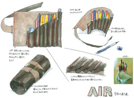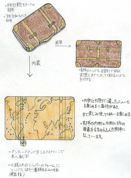 テーマは手に取ったら”旅”に出たくなる。日々、人は日常の中で”旅”をしています。通勤、通学といった”旅”をしています。その旅の中で毎日使い、使う度に味わいを楽しめるものを提供したいと考えたものです。