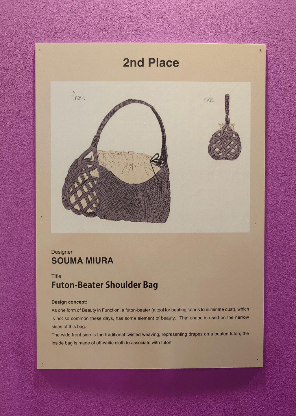用の美をテーマとし、あまり見なくなってしまった「布団たたき」に美しさを見つけ、側面全面にそのデザインを活かす。 フロント面には伝統的なもじり編みのデザインとし、布団の布がたたかれたようなドレープ柄を再現、中袋にはアイボリーの布を使用しより布団を再現